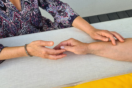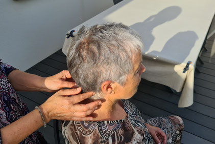 Il s'agit d'un toucher en douceur, un effleurement, sur 3 zones : les pieds, les mains et la tête.